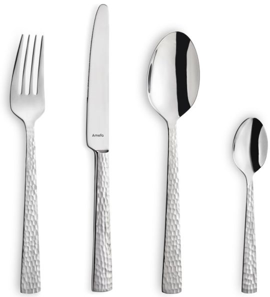 Looking for every day, but special cutlery? The Felicity cutlery from Amefa brings the feeling of craftsmanship to the table according to the latest trends. The collection is characterized by its coarse, hammered decoration on the handle in combination with the high-gloss finish in 18/0 stainless steel. The cutlery is suitable for 6 people and is easy to clean in the dishwasher.