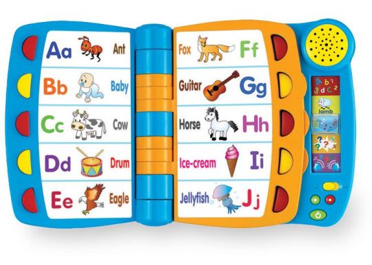 Book design with 3 turning pages. Interactive talking book with 5 activities in clades letters/numbers/shapes/objects and word recognition, fun sounds and music, Quiz game, and memory match game.